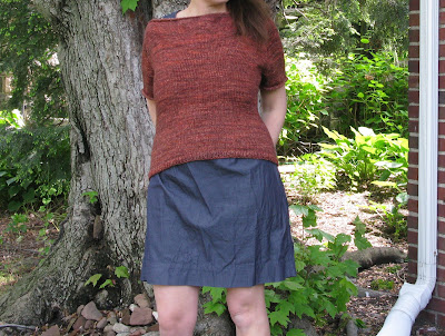 I had planned for this to be knit in the Autumn but was sidetracked and then picked it up last month. I had a little confusion regarding the neckline but the nice women of Ravelry helped me out with new directions and a diagram and then I restarted it. This was a nice top down raglan to knit and the finishing was simple since it was knit in the round. I really loved the yarn and color that the designer went with so I used the same. The only disappointment came when I realized I wasn't going to have enough yarn and acquiring more wasn't in the cards. How I solved the issue was to make the bottom band a bit shorter and knit it as short sleeves instead of 3/4. I also left off the bands on the sleeves. And, I went down one needle size. It was my first time knitting with Becoming Art Yarns, this is the Suave Sport and it has a nice hand and good stitch definition. Though this sweater is more of an Autumn color I think I will wear it a few times this Spring. I am pretty happy with how it turned out and look forward to knitting more patterns from this designer.